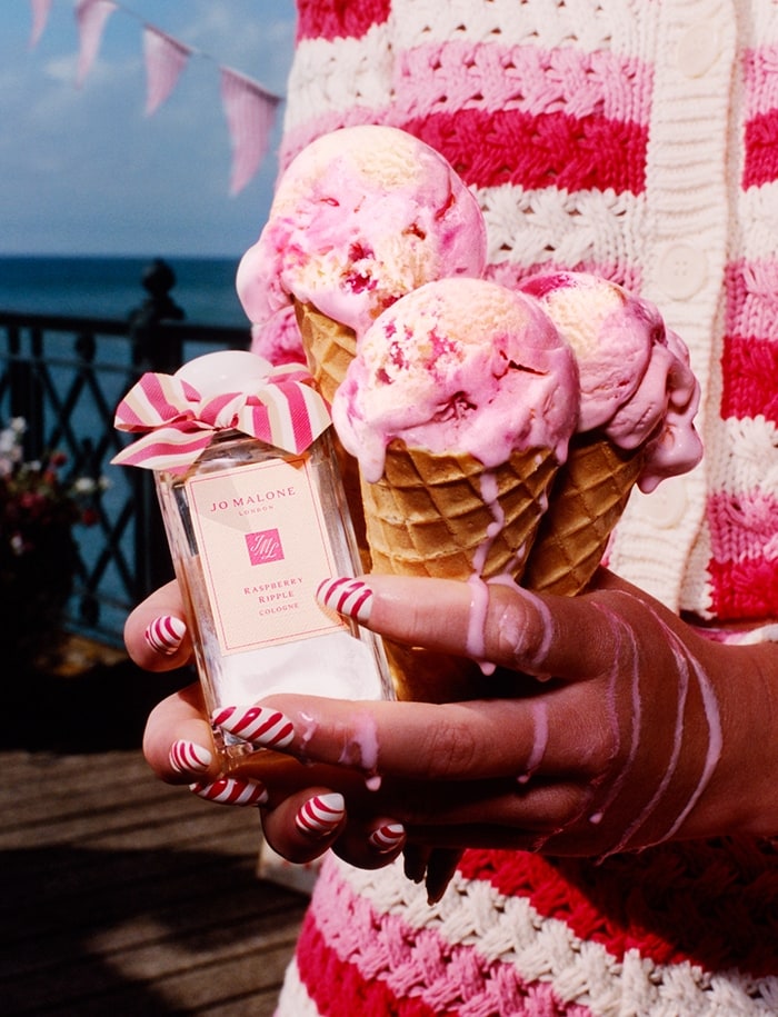 Het ijs in kwestie: Raspberry Ripple. Het klassieke, heerlijk romige en zachte vanille-ijs vol met sappige framboosjes. Raspberry Ripple is een nostalgisch basisproduct van Britse zomers en vormt de inspiratie voor - en de naam van - Jo Malone London’s nieuwe geur.